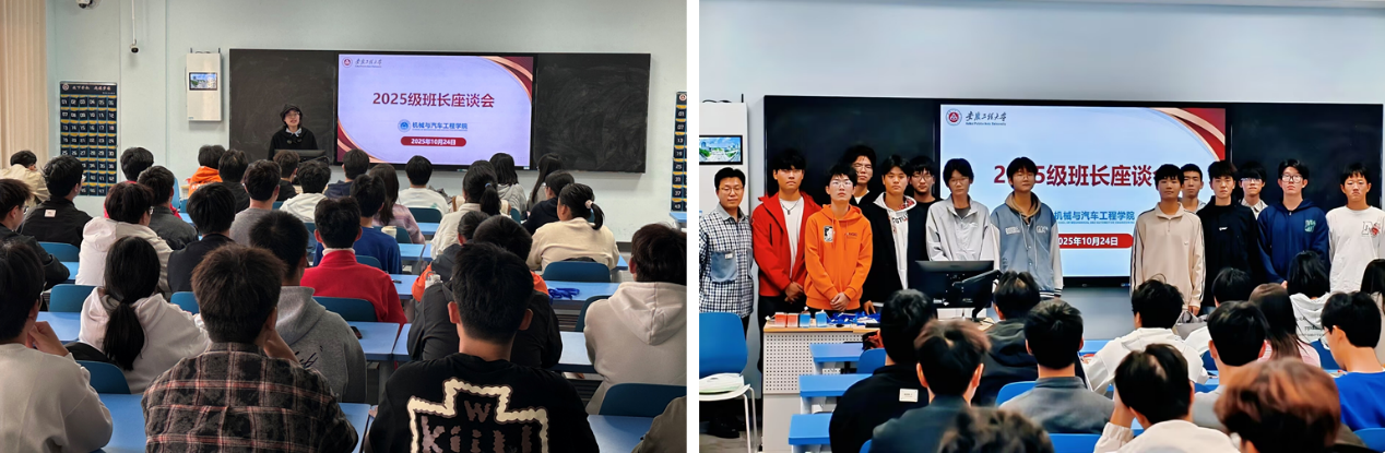 本网讯 为进一步激发学生主人翁意识,提升学生自我教育、自我管理、自我服务能力,10月24日,机械与汽车工程学院分别组织开展了2025级学生社区自我管理委员会成立仪式、学风监督员聘任仪式以及班长座谈会。学院党委副书记秦广虎,院团委书记、2025级全体辅导员及各学生组织、班级学生代表参加了相关活动。