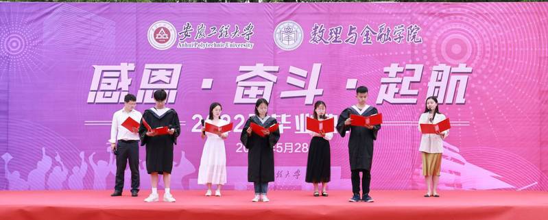 典礼上,毕业生代表统计183班方钱燕同学深情回顾在数理与金融学院学习生活的点点滴滴,并对学校和学院的培育、老师的指导、家长和朋友的陪伴表示由衷感谢,希望“他日重逢,各领风骚”。金融中外182班王子航的父亲王万海代表家长希望全体毕业生乘风破浪,大胆向前,接好青年一代的接力棒;牢记使命,时刻牢记老师的嘱托;互帮互助,将校园里的美好情谊继续下去。王子航向自己的父亲送上了温暖的拥抱和鲜花,并代表全体学子感恩所有的父母与家人。王万海热泪盈眶的说“孩子长大了”。《送别》《那些年》《盛夏》等师生歌曲串烧表演,诉说着毕业的不舍,也宣告起航新征程。大学四年都是“淘气包”的金融中外181的冯其正说,“我们金融中外专业的都很调皮,感谢老师和辅导员陪着我们一路成长。今年我参加了西藏山南的专招,我们专业一共有3名同学报名去西部,希望能够实现热血青春。我今天特别收集了老师和同学们的签名在我的T恤上,我要一直保存着它,这是我大学成长的见证。”