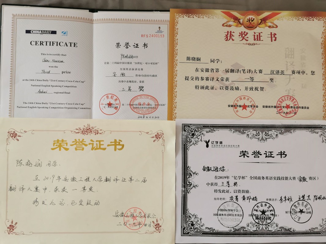 获奖情况:三次获得三好学生称号、两次优秀团员称号、两次一等奖学金、校级省级翻译大赛一等奖、安徽省可口可乐杯演讲比赛三等奖、安徽省亿学杯商务英语竞赛三等奖。