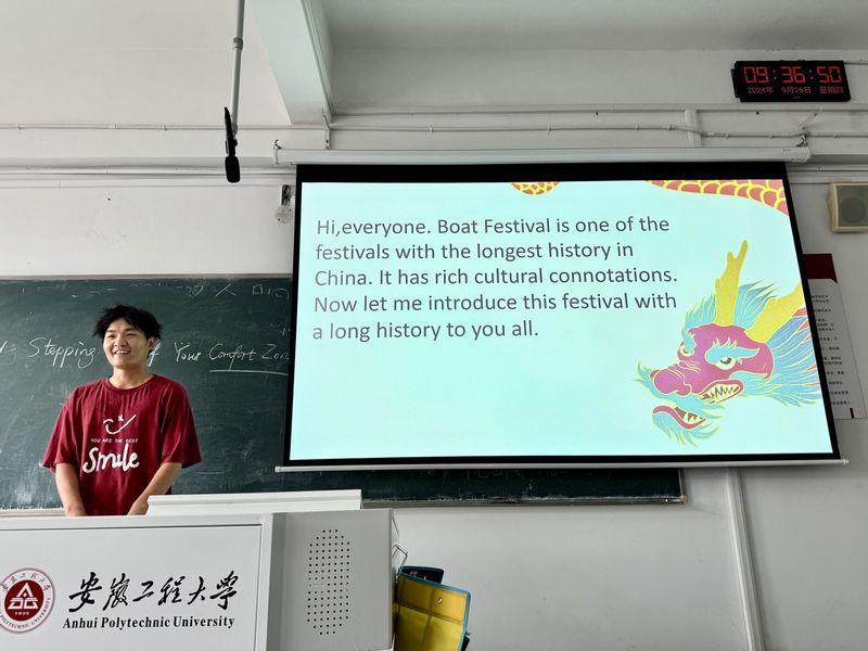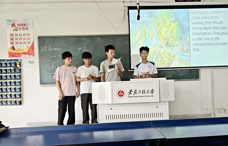 “开学第一课”,新生登台演讲初体验,英语口述传统文化精彩纷呈。9月下旬,2024级新生迎来了他们大学里的第一堂英语课。与以往不同的是,这次课程导入在课前就已经完成。公共英语课的老师们课前向同学们介绍了“课堂五分钟”“用英语讲中国故事”活动方案,为大家提供了汇报主题池供参考,按照班级规模和学生构成进行了分组,对演讲注意事项等进行指导。新同学们跃跃欲试,小组间分工明确,合作收集素材,制作ppt,现场汇报气氛热烈。从古代先贤孔子所倡导的儒家思想,到中国茶文化的历史传承,再到都江堰等古代水利工程奇迹等。这些历史人物、文化习俗、现代成就,都在他们的讲述中焕发出新的光彩。区块链241班的刘德恩同学说:“第一次上这样的英语课,与高中完全不一样。第一次课就站到讲台上进行展示,我感到很新奇,也很幸运。通过用英语讲述中国故事,我们不仅锻炼了自己的口语表达能力,还加深了对中国文化的理解和认同。这样的活动对我们的成长非常有帮助。”法学243班的朱俊豪同学在完成演讲后激动地说:“站在台上的每一刻都充满了挑战,但当我看到老师和同学们的认可和掌声时,更多的是成就感。这不仅是一次语言的展示,更是自我成长的宝贵经历。我感受到了用英语讲述中国故事的力量,也更加坚定了自己学好外国语,做好中国人,传播好中国声音的决心。”