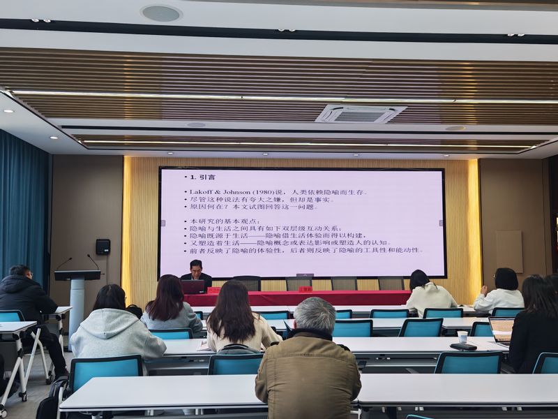 报告会上,卢卫中作了题为“生活中的隐喻与隐喻中的生活——论隐喻的体验性和能动性”的学术报告。卢教授从日常生活中的隐喻现象切入,从认知语言学的隐喻理论、生活中的隐喻、隐喻中的生活以及隐喻的研究价值等五大方面系统阐释了隐喻的“体验性”与“能动性”双重属性,并通过详实生动的隐喻案例,揭示了隐喻在塑造社会认知、传递文化价值观中的能动作用。同时,卢教授还提到了在人工智能时代,大语言模型与隐喻认知机制的对比研究。